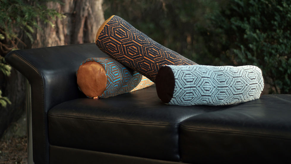 Dicht gestrickt aus Baumwolle und Chenille-Baumwolle. Seitlich Leder Einsätze, die Rolle ist mit einem Reissverschluss verschliessbar. Die Füllung aus Dinkelspelz oder Daunen